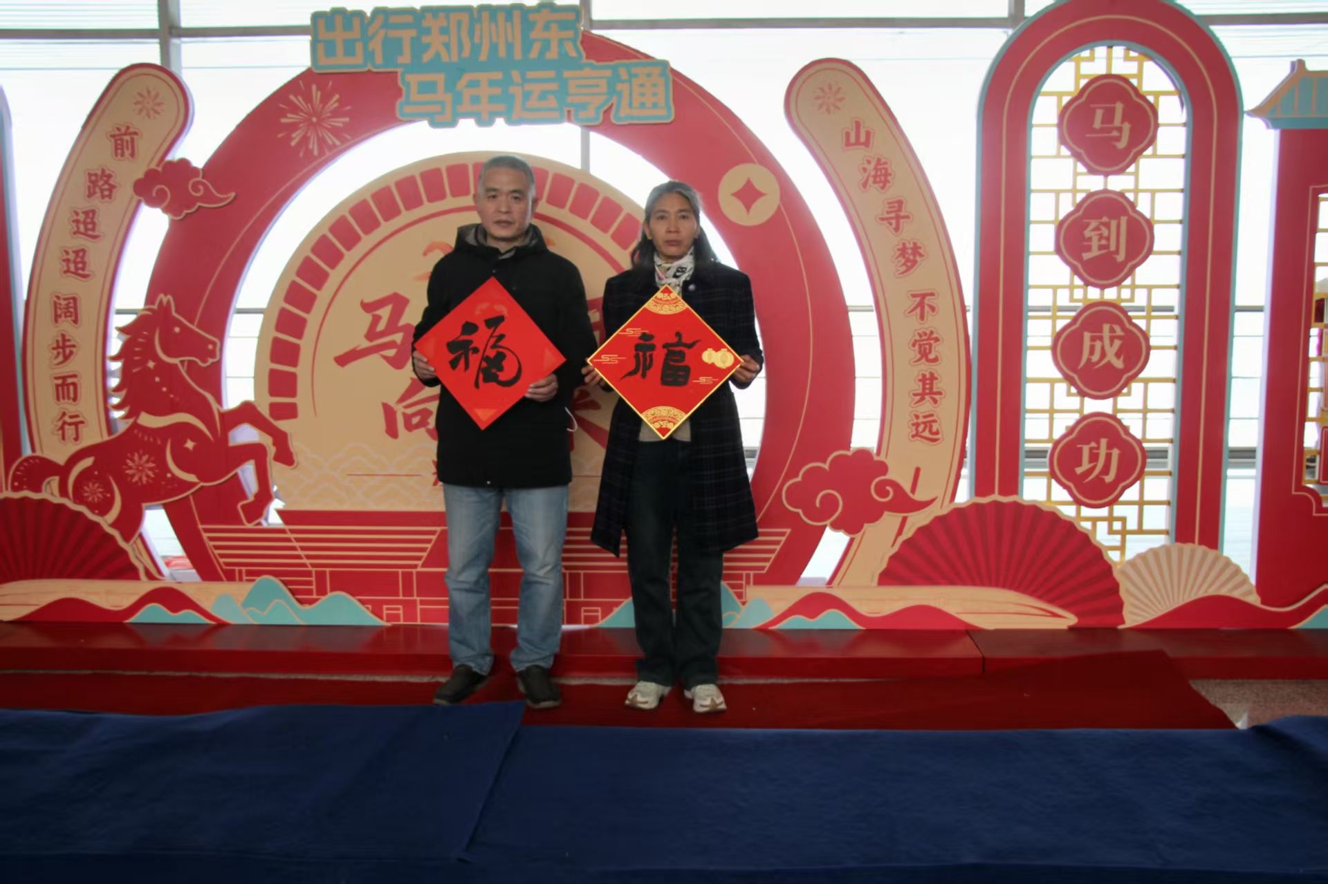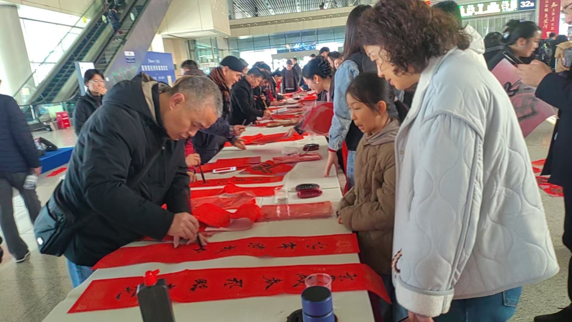 郑州东站作为全国重要交通枢纽,候车大厅内人头攒动,往来旅客纷纷驻足参与,现场墨香氤氲、暖意融融,洋溢着浓浓的新春气息。红色春联纸整齐铺展,墨香与春运的烟火气交融,成为车站内一道兼具文化韵味与新春气息的风景线。艺术家们凝神挥毫,篆、隶、楷、行各体兼备,“丙午呈祥春入户,骏马奔腾福临门”“高铁驰程通富路,盟心送福暖归途”等一幅幅寓意吉祥的春联跃然纸上,既饱含马年奔腾向上的美好期许,又融入中原文化的深厚底蕴,更承载着民盟组织对旅客的真挚关怀,成为旅客行囊中最珍贵的“文化伴手礼”。